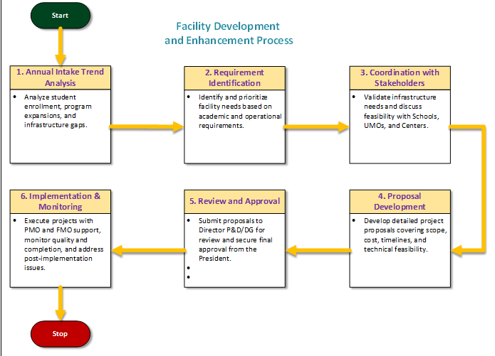 Covers the assessment, planning, approval, execution, and monitoring of facility development and enhancement projects across UMT.